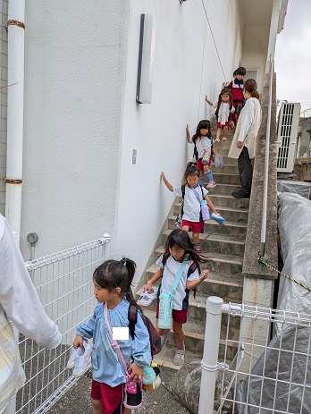 今日は実際に風も強く、慣れない非常階段を使っての避難に戸惑う子もいましたが…
